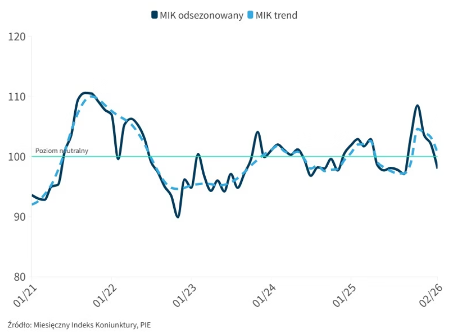 Wskaźnik MIK Polskiego Instytutu Ekonomicznego przez ostatnie cztery miesiące utrzymywał się powyżej poziomu neutralnego. Oznaczało to, że przedsiębiorcy przejawiali dominację nastrojów pozytywnych nad negatywnymi. Jego lutowy odczyt osiągnął jednak wartość 98 pkt, co oznacza jego miesięczny spadek o 4,1 pkt. Choć wciąż brak mu jeszcze wiele do najniższego wyniku, to tak znacząca redukcja może zastanawiać.