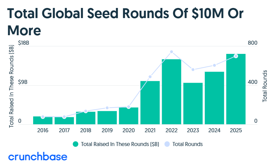 Pierwszą z nich jest fakt, że coraz częściej finansowania zalążkowe osiągały naprawdę imponujące wartości. Wystarczy wspomnieć, że do tej pory w roku 2025 inwestorzy przeprowadzili prawie 700 rund, których wartość wyniosła co najmniej 10 mln dolarów. To sprawia, że już teraz możemy mówić o rekordzie.